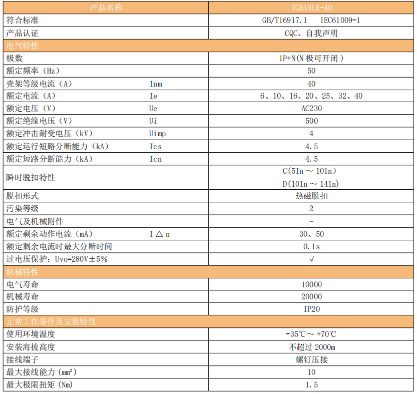 TGB1NLE-40系列剩余电流动作断路器(以下简称漏电断路器)主要适用于交流 50Hz,额定工作电压 230V,额定电流至 40A的线路中,当人身触电或电网泄露电流超过规定值时,剩余电流动作断路器能在极短的时间内迅速切断电源,保护人身及用电设备的安全,并且有过载、短路、过压(TGB1NLG-40)及在正常情况下作为线路的不频繁转换之用,尤其适用于工业和商业的照明配电系统。.